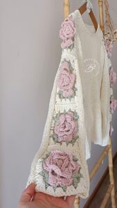 🌸 En la siguiente foto pueden ver como quedan estos grannys en las mangas del Sweater Tilcara