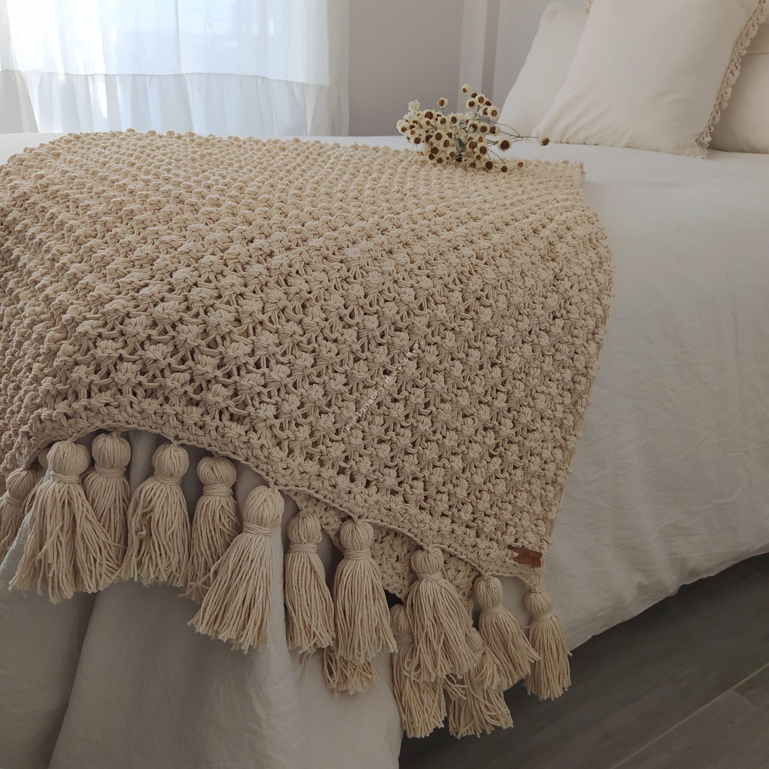 Para usar este modelo como pie de cama, depende cuanta caída quieras tenga a los laterales deberás calcular el ancho de tu colchón más: min. 30 cm/ máx 50 cm. extras a cada lateral (flecos y borlas incluidos)